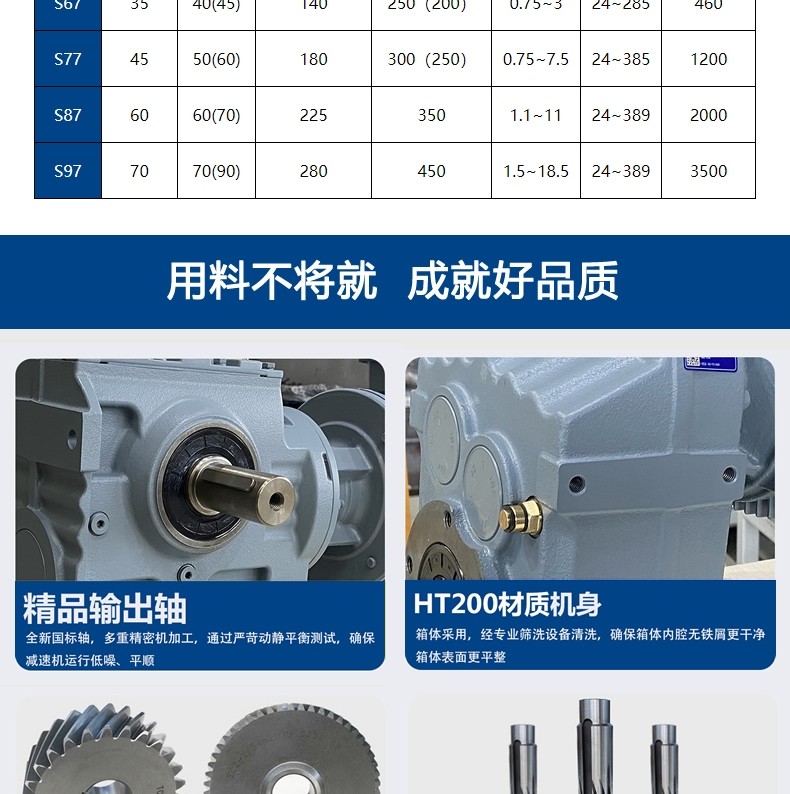 1,电机自己生产,台系标准,比国标电机功率更足,温升控制更稳定;2,交货周期短,标准品7-10天(特殊情况,可1-2天交),非标15天;3,配套齐全,电机,连接法兰,扭力臂,锁紧盘,组合机各种类型;4,齿轮材质采用20CrMnTi+渗碳工艺处理,能有效提高齿轮的承载能力,整套齿轮与齿轴采用磨齿修行工艺,齿轮运行噪音更低;5,输出轴采用40Cr+调质高频处理,油封位采用径向磨削,提高耐磨性,降低漏油风险;6,油封采用氟橡胶类型,降低漏油风险。